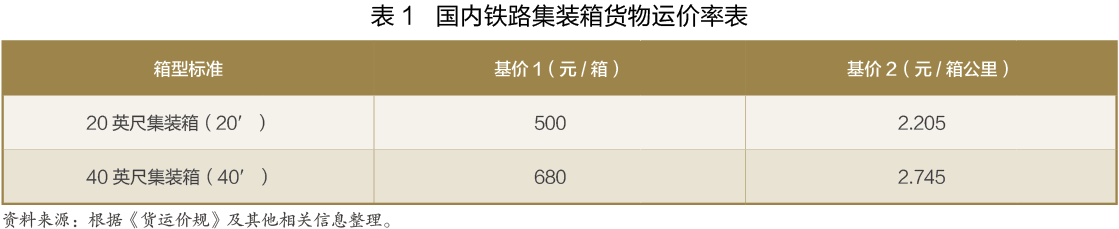 根據(jù)《中華人民共和國鐵道部鐵路貨物運價規(guī)則(鐵運[2005]46號)》(以下簡稱“貨運價規(guī)”)以及國家發(fā)展改革委發(fā)布的關(guān)于調(diào)整鐵路貨物運價價格的相關(guān)通知文件(《國家發(fā)展改革委關(guān)于調(diào)整鐵路貨運價格進一步完善價格形成機制的通知》發(fā)改價格〔2015〕183號),國際鐵路聯(lián)運的國內(nèi)段集裝箱貨物運輸?shù)摹盎鶅r1”(也稱發(fā)到基價)為500元/TEU(20英尺箱)和680元/FEU(40英尺箱),“基價2”(也稱運行基價)為2.205元/TEU*公里和2.754元/FEU*公里(見表1)。集裝箱貨物每箱運費的計算方法為基價1+基價2×運價公里。此外,按照鐵路相關(guān)規(guī)定,國際鐵路聯(lián)運的國內(nèi)段運輸,還需要繳納電氣化附加費、新路新價均攤費、鐵路建設(shè)基金等費用,由于項目較多且近年來有所調(diào)整,在此不再贅述。值得一提的是,2016年11月,國家發(fā)展改革委發(fā)布《關(guān)于清理規(guī)范涉及鐵路貨物運輸有關(guān)收費的通知》(發(fā)改價格〔2016〕2498號),要求相關(guān)收費主體限期清理規(guī)范鐵路貨物運輸過程中除鐵路運價之外的各種收費,其中涉及鐵路運輸企業(yè)的收費包括鐵路貨物運輸雜費、向?qū)S镁產(chǎn)權(quán)或經(jīng)營單位收取的專用線代維修代維護等費用。