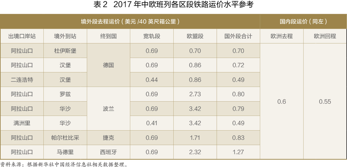 根據(jù)2017年各班列運行線路公布的運價水平,寬軌段的去程平均運價水平大多為0.69美元/大箱公里,經(jīng)二連浩特和滿洲里出境利用西伯利亞大陸橋的運價較低,約為0.4美元/大箱公里;歐盟段的去程平均運價水平差異較大,根據(jù)不同線路走向,從0.7美元/大箱公里至3.42美元/大箱公里不等,高運價率的區(qū)段一般是由于運輸里程較短,固定費用分?jǐn)傒^多所致。國內(nèi)段的去程平均運價水平約在0.6美元/大箱公里,回程平均運價水平約在0.55美元/大箱公里(見表2)。