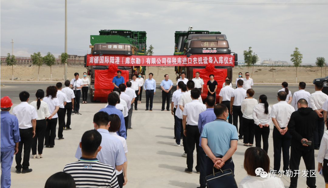 2020年6月11日,6臺CP690自走式大型采棉機“保稅運輸”順利抵達(dá)南疆國際陸港(庫爾勒)有限公司公用型保稅倉庫,實現(xiàn)了南疆國際陸港(庫爾勒)有限公司與天津港海陸兩港聯(lián)動。